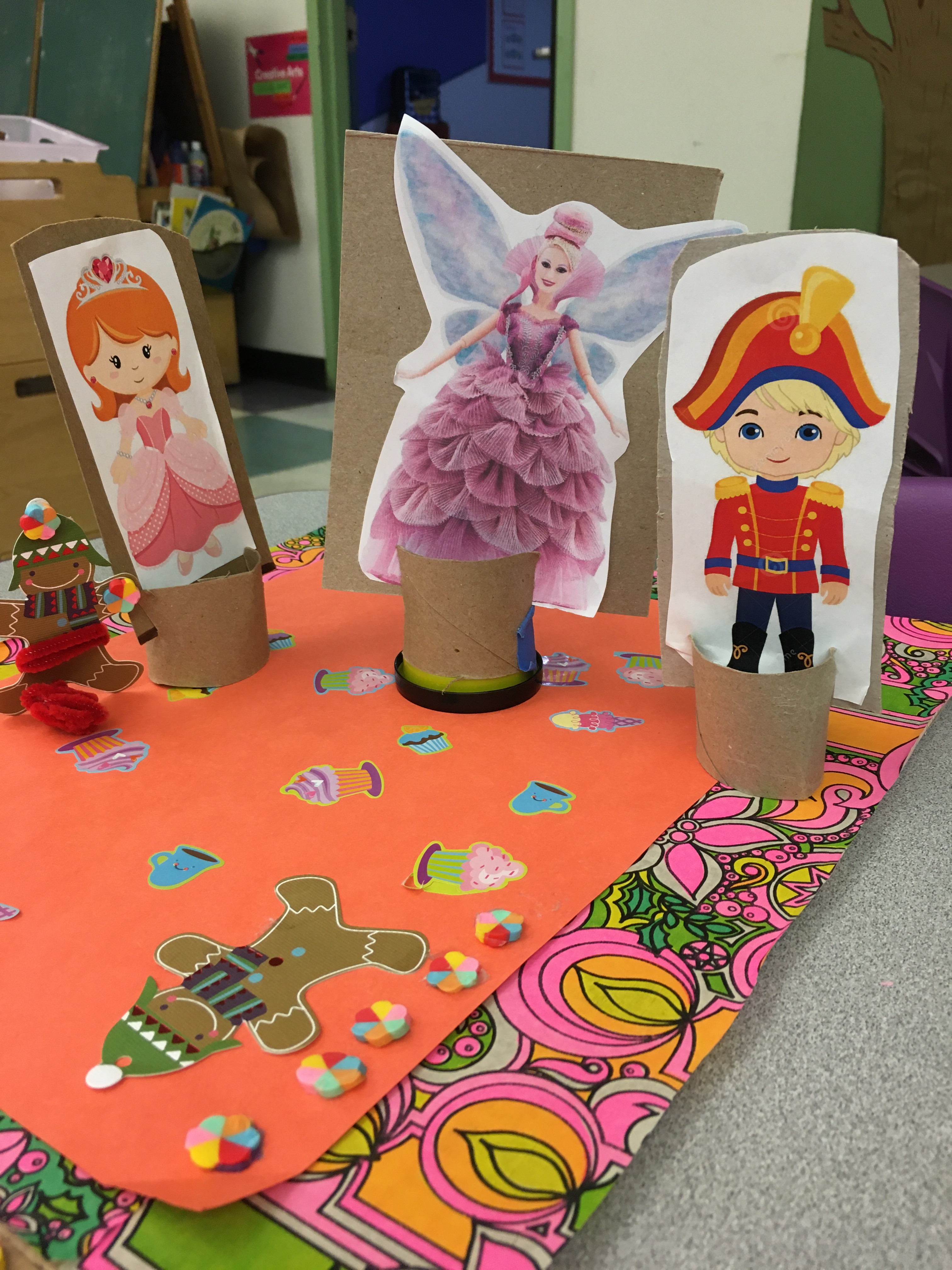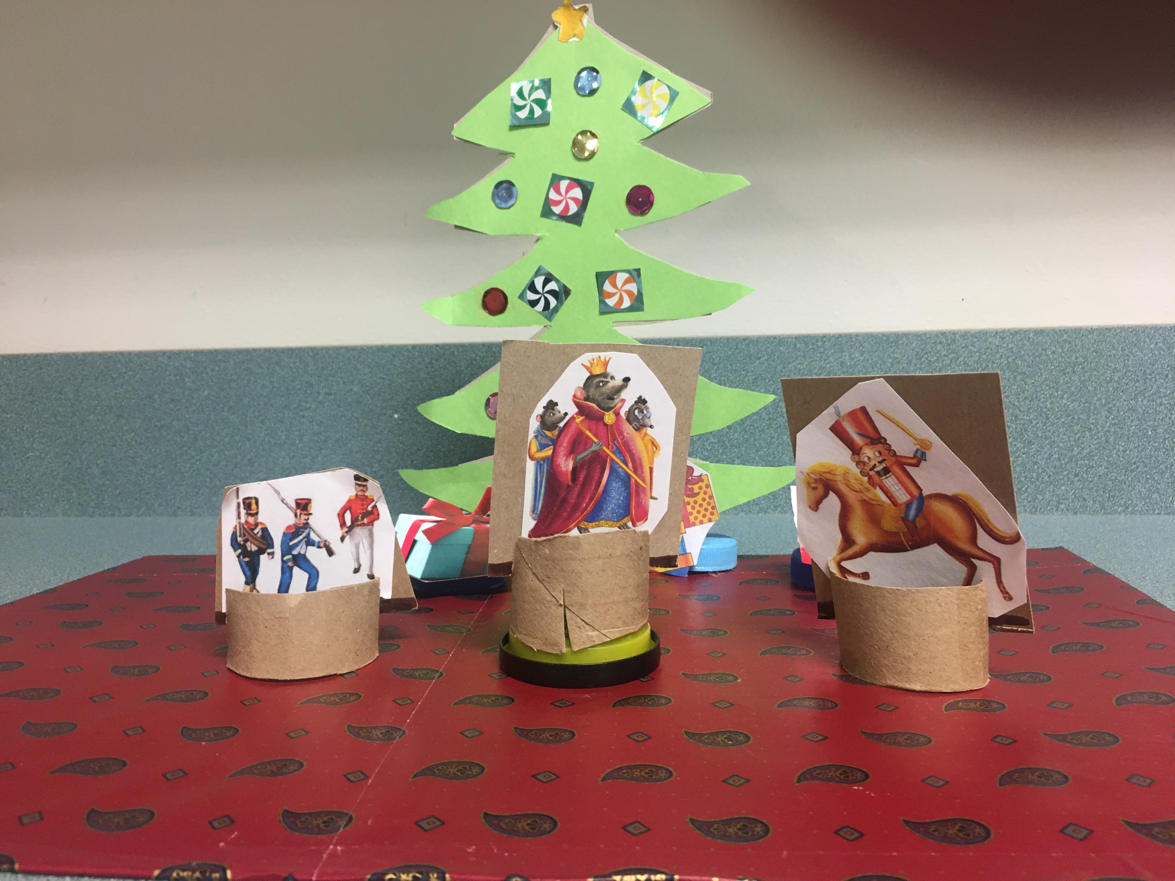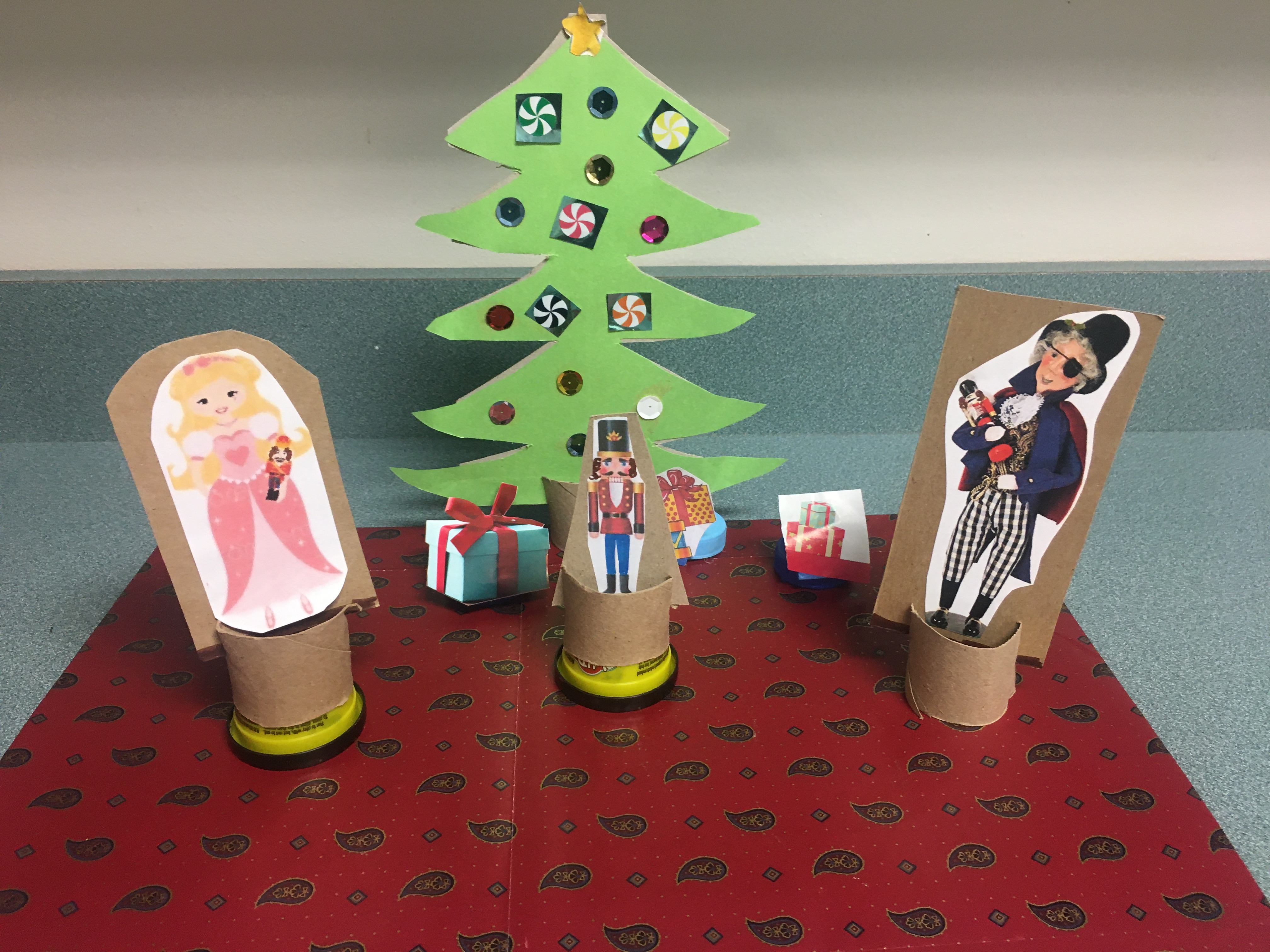 There are two core settings in a book: Stahlbaum’s house and Candyland. For the base of each setting you may use cardboard cut out from cereal box. Your child will help you to glue colorful wrapping or construction paper on top of the base. He might also have fun decorating the base with drawings, stickers, bright buttons, confetti, sequins, or any other colorful items you can find in a house. Don’t forget the Christmas Tree: your child (or you) may cut it out of construction paper and decorate it as well. You can find images for the characters online, print them, cut out (alternatively, your child might do the cutting). The last part is to make your Christmas Tree and characters “stand”. First of all, you can make them sturdy by gluing them to the card board and then cutting out again. My students and I made standees by cutting rings (about 3 inches tall) from paper towel tube, making two vertical cuts on both sides of each ring, and inserting the tree and the characters into the cuts. If this construction feels flimsy, feel free to make it sturdier by using scotch tape and small playdough containers underneath standees. Or better yet, create your own standee!