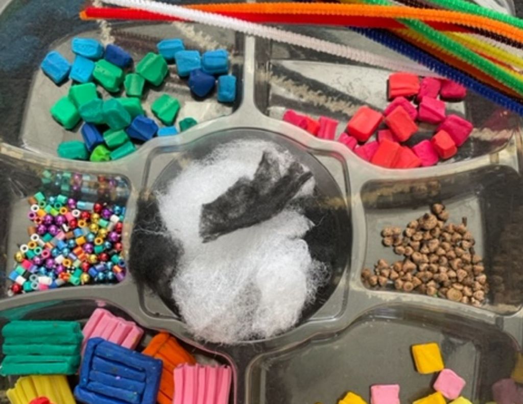 - Present combination of different types of materials: natural and recyclable, cardboard and play dough, plastic and tissue paper.